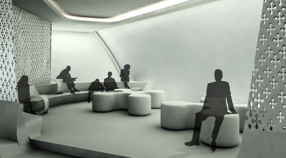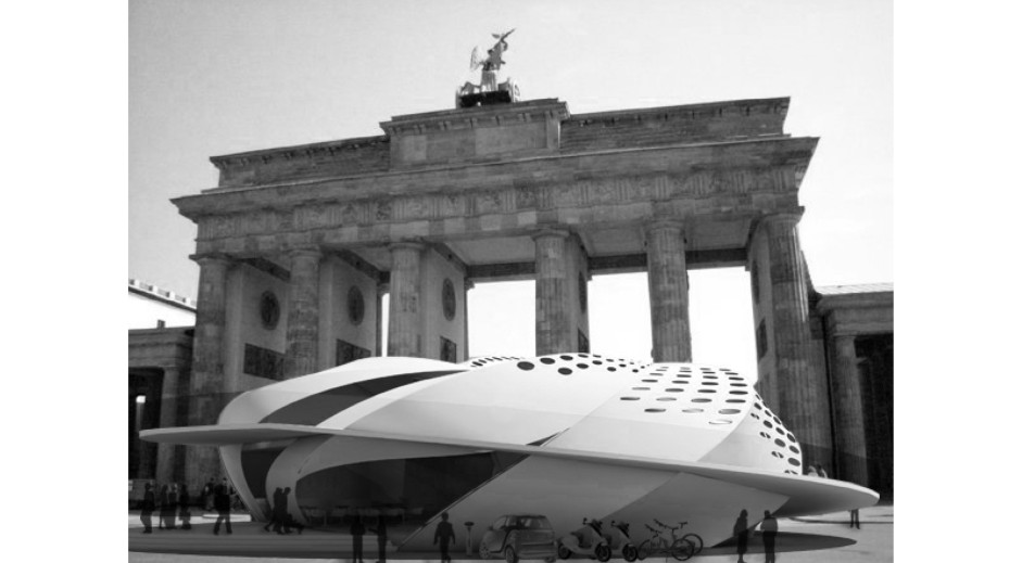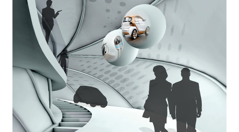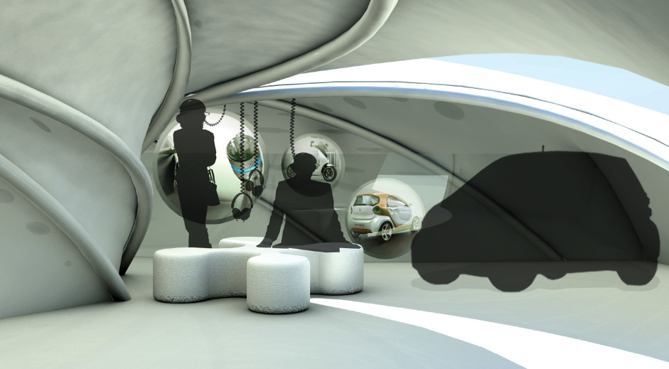 e-motion ist ein mobiler Pavillon in dem Elektromobilität erlebbar gemacht wird. Elektroautos und Fußgänger teilen sich den Innenraum und die Rampen. Diese enge Begegnung ist möglich durch die neue Technologie der Personenerkennung sowie die Vorteile der Elektromobilität: Emissionsfreiheit und Geräuschreduktion.