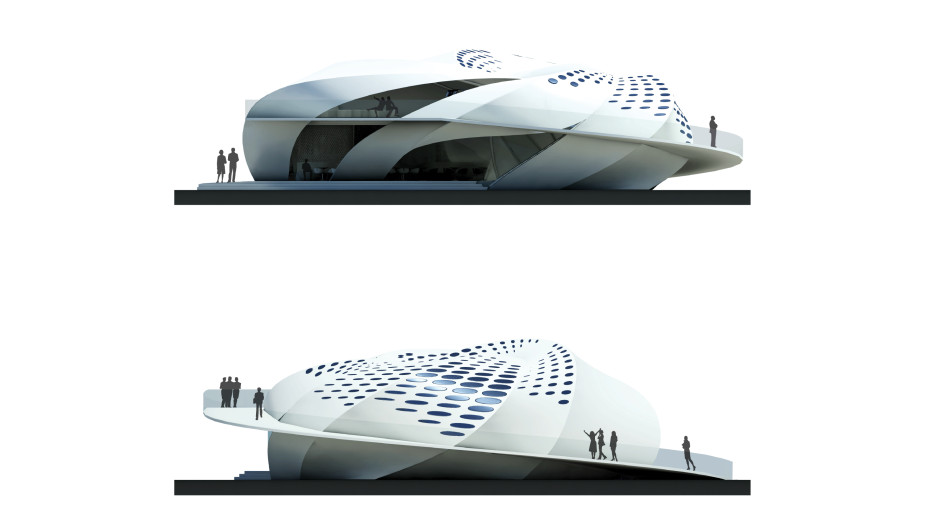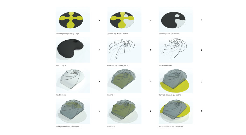 Der ökologische Pavillion besteht aus recycelten, recycelbaren oder nachhaltigen Materialien, z.B. ist die Fassade aus recycelter LKW-Plane gemacht und wird später zu Taschen weiterverarbeitet. Solarzellen auf der Fassade versorgen den Pavillion mit der benötigten Energie.