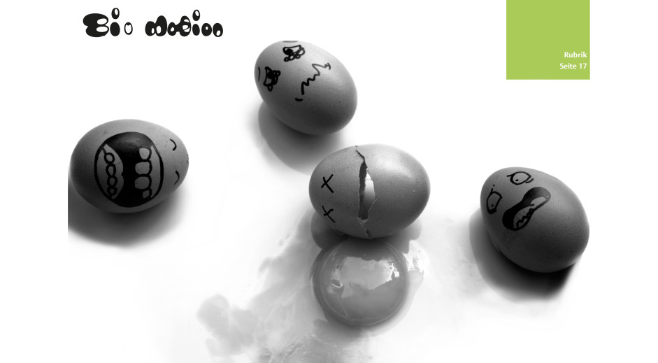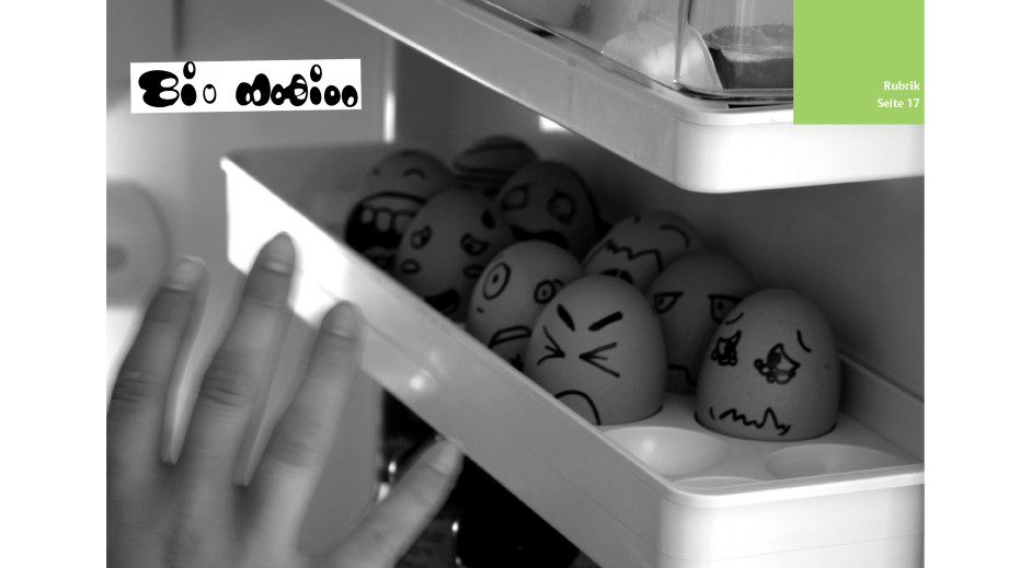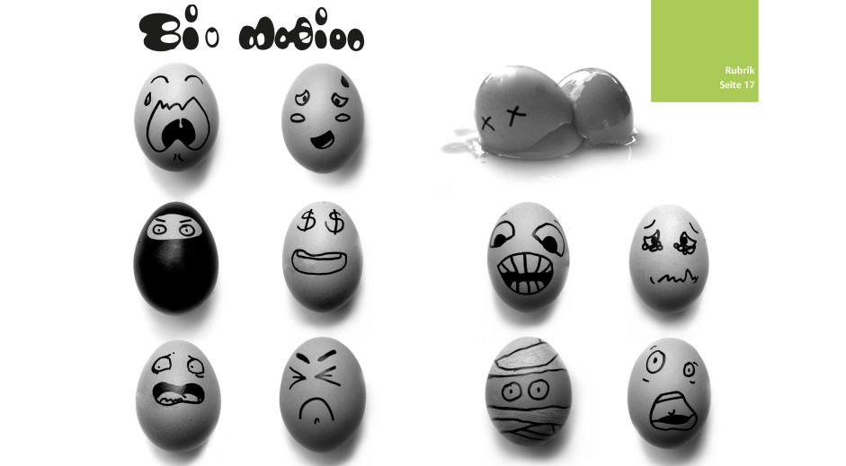 Eine Doppelseite für ein Magazin der Detmolder Schule für Architektur und Innenarchitektur soll gestaltet werden. Eine freie Interpretation zum Thema ‚Ei-Motion‘ ist gefordert. Durch Bewegung (=motion) zerbricht ein Ei, die anderen Eier zeigen unterschiedliche Emotionen.