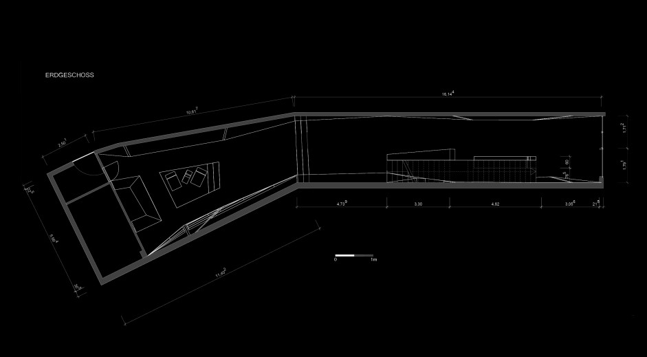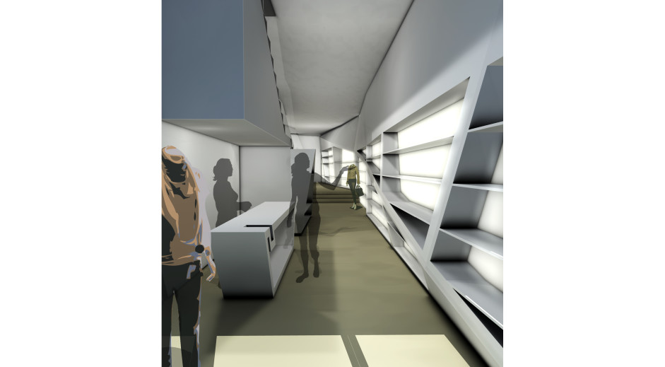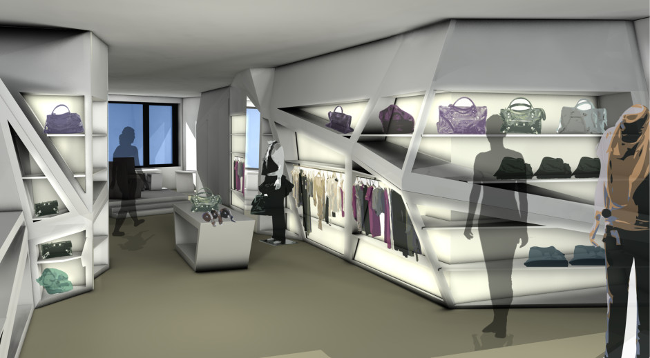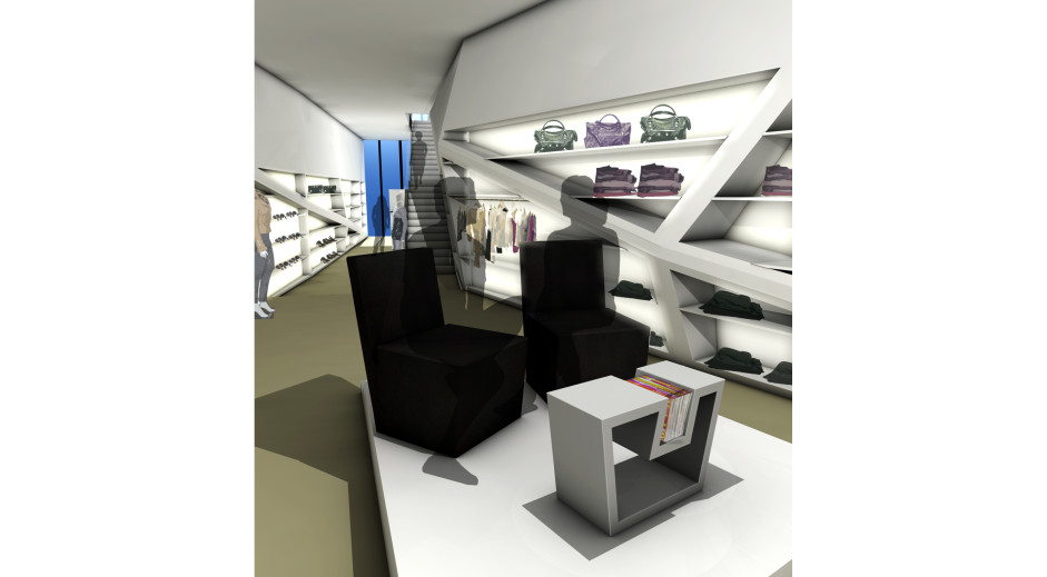 Das bestehende Modegeschäft in der Hamburger Innenstadt bietet hochpreisige exklusive Ware für jedes Alter an. Das Konzept für die Gestaltung beruht auf dem ungewöhnlichen Grundriss des Erdgeschosses: das unregelmäßige Rechteck aus dem hinteren Bereich wurde auf das gesamte Regal- und Displaysystem übertragen. Es ergeben sich nahtlose, monolithische Skulpturen mit komplexen Faltungen. Diese ergeben sich durch die Diagonalen der Wandabwicklungen und die Winkel der frei im Raum stehenden Objekte (Tresen, Displaymöbel und Podeste).