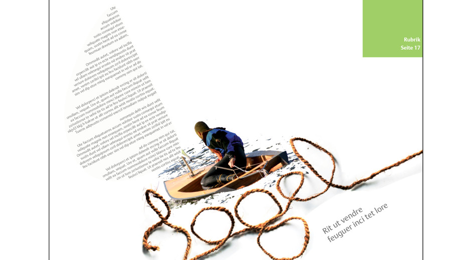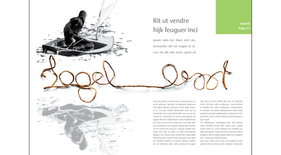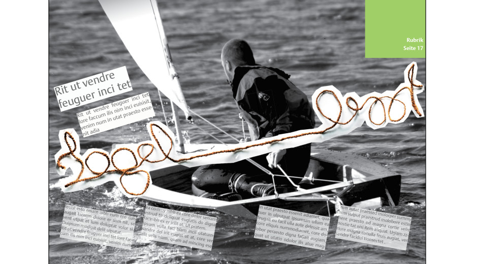 Eine Doppelseite für ein Magazin der Detmolder Schule für Architektur und Innenarchitektur soll gestaltet werden. In dem Artikel geht es um einen Mann und sein selbst gebautes Segelboot. Hauptelement der Layouts ist der Schriftzug ‚Segelboot‘, der mit einem Band gelegt und abfotografiert wurde.