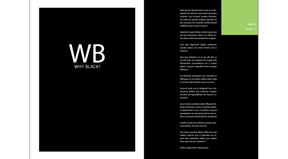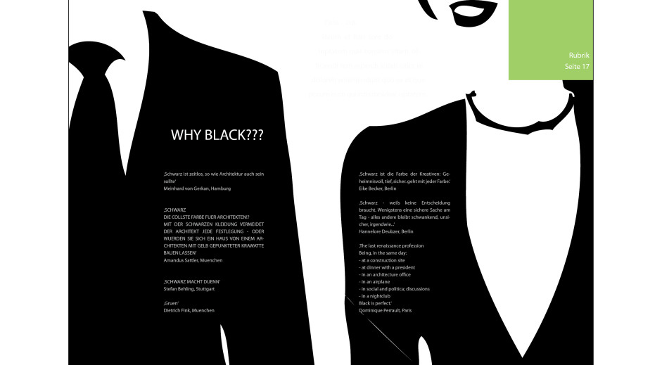 Eine Doppelseite für ein Magazin der Detmolder Schule für Architektur und Innenarchitektur soll gestaltet werden. In dem Artikel geht es um das Buch ‚Why do architects wear black?‘, kurz: ‚WHY BLACK?‘ Das Design ist in den Kontrastfarben Schwarz und Weiß gehalten.
